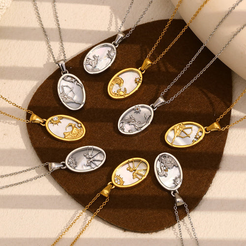 12 Zodiacs Oval Shape Pendant White Zircon Natural Shell element Stainless Steel 18K Gold Plated Trendy Link Chain Fashion